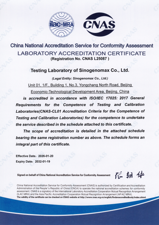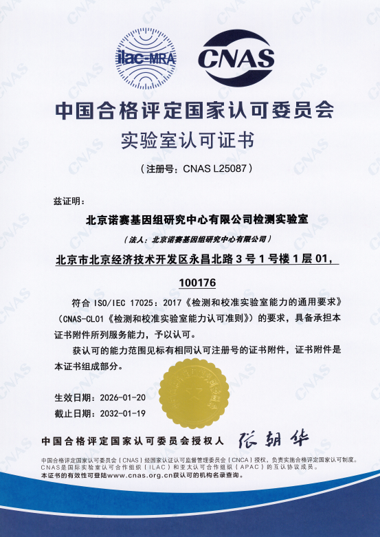 2026120日,北京诺赛基因组研究中心有限公司检测实验室正式获得中国合格评定国家认可委员会(CNAS)授予的实验室认可资格(注册号:CNAS L25087),证明我司检测实验室符合ISO/IEC 170252017《检测和校准实验室能力的通用要求》(CNAS-CL01《检测和校准实验室能力认可准则》)的要求,具备出具国际互认检测报告的能力。