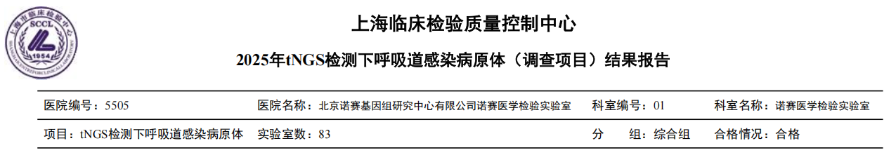 近日,上海临床检验质量控制中心发布2025年tNGS检测下呼吸道感染病原体(调查项目)结果。本次调查共有83家单位参与,北京诺赛基因组研究中心有限公司诺赛医学检验实验室顺利通过考核。